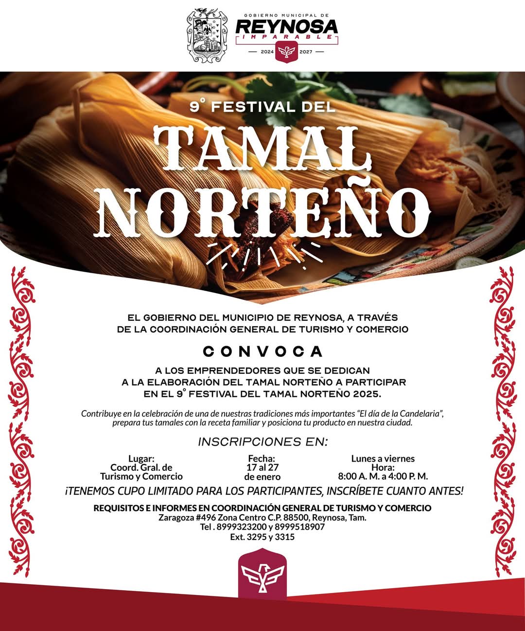 Una invitación a la novena edición del Festival del Tamal Norteño 2025 dio a conocer el Presidente Municipal Carlos Peña Ortiz, para los emprendedores que quieran posicionar sus tamales con la receta familiar en nuestra ciudad, Reynosa, Imparable en tradiciones mexicanas.