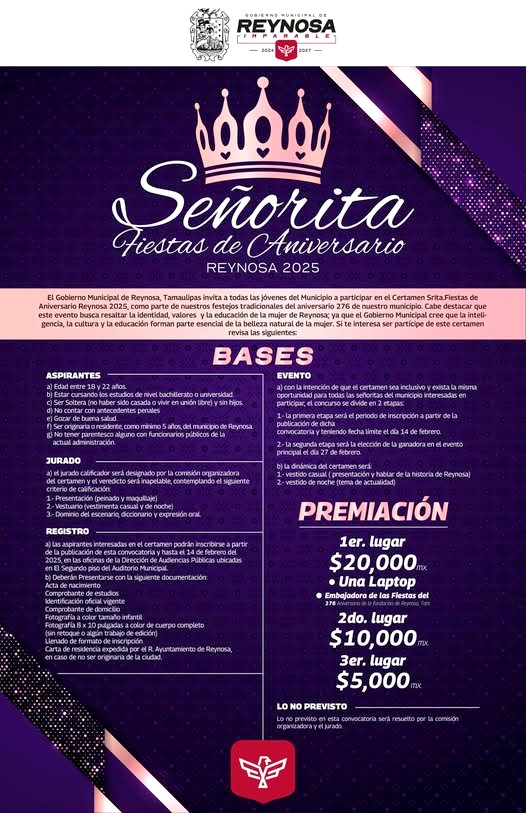 Invitan a jovencitas a participar en certamen Señorita Fiestas de Aniversario Reynosa 2025