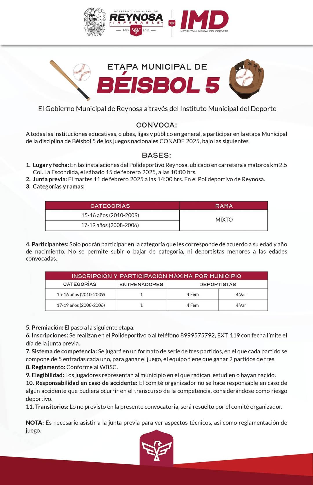 Con el objetivo de impulsar el deporte y brindar oportunidades a los jóvenes talentos de la ciudad, el Alcalde Carlos Peña Ortiz convoca a instituciones educativas, clubes, ligas y al público en general a participar en la Etapa Municipal de Béisbol 5, clasificatoria para los Juegos Deportivos Nacionales CONADE.