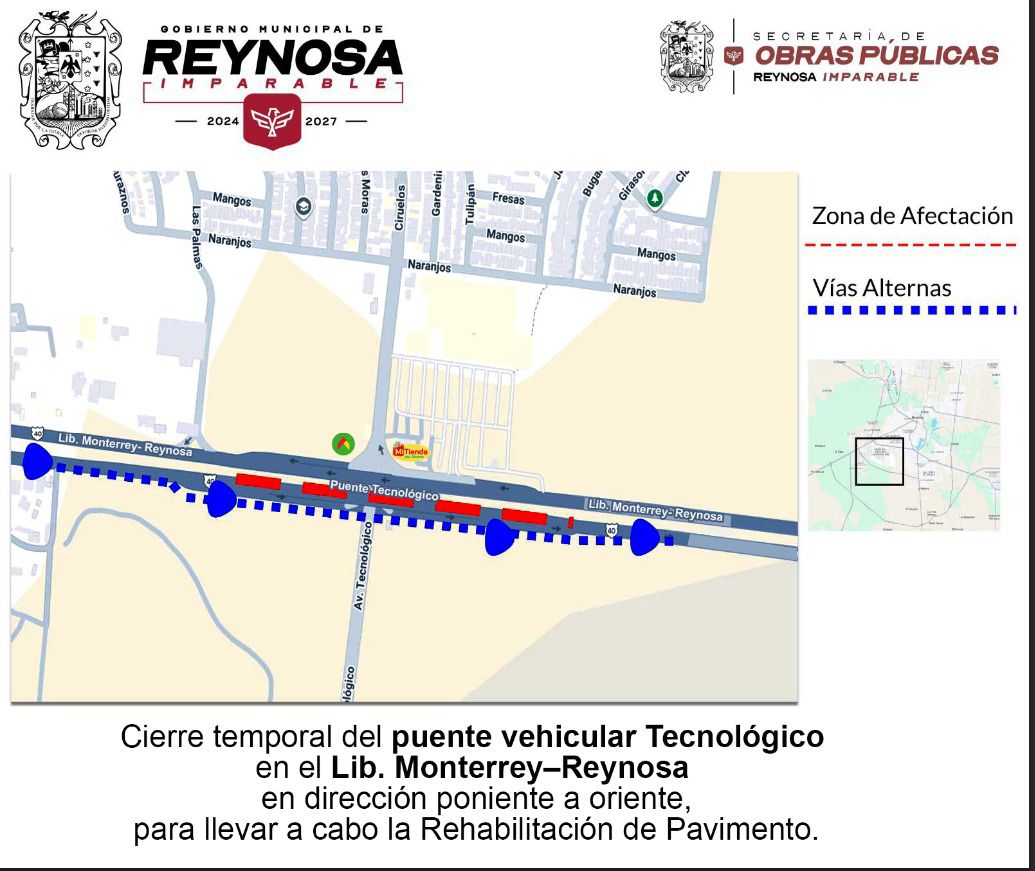 El Gobierno Municipal de Reynosa cerrará parcialmente el puente vehicular sobre el libramiento Monterrey-Reynosa a la altura de la avenida Tecnológico, cuyos carriles en sentido de Poniente a Oriente serán rehabilitados el día jueves 24 de abril a partir de las 9:00 de la mañana.