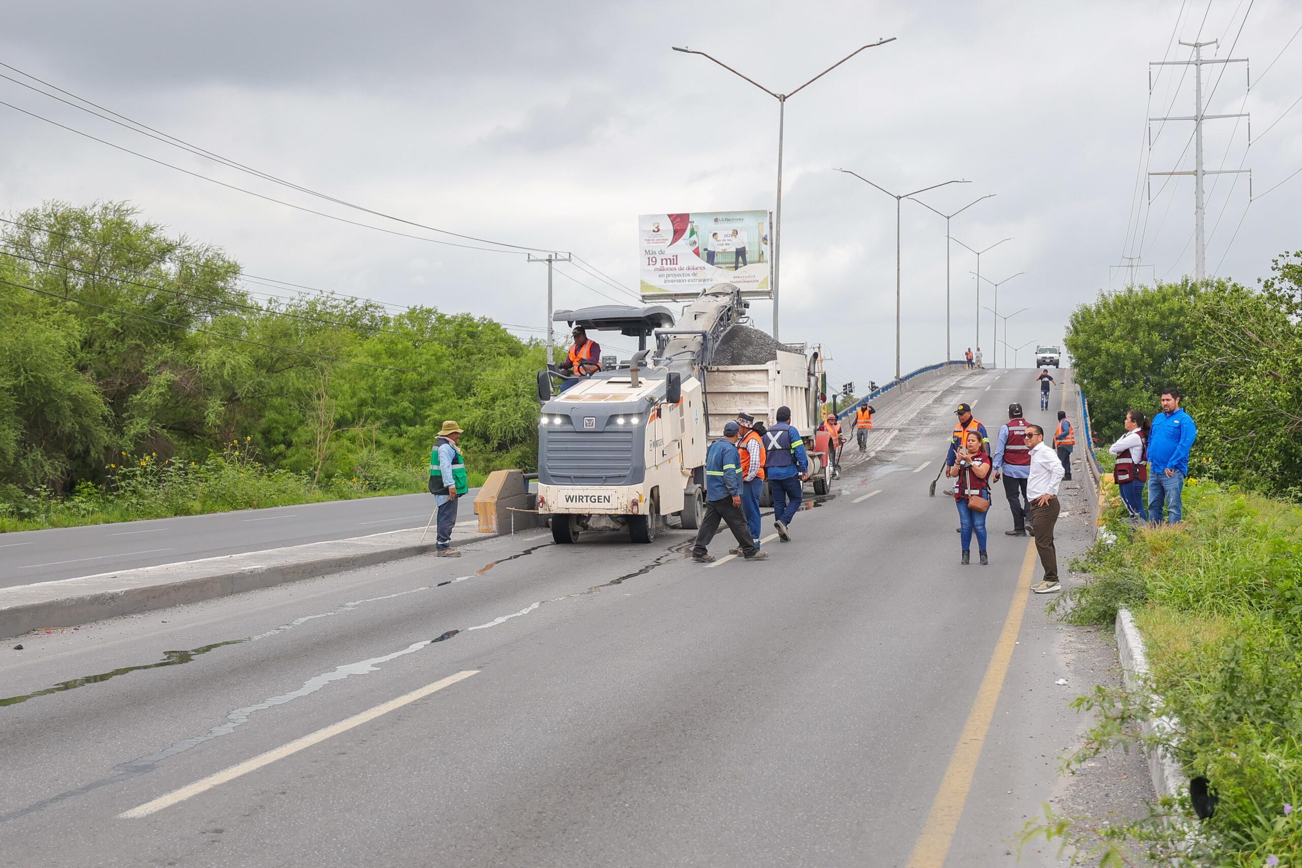 El Presidente Municipal Carlos Peña Ortiz supervisó el desarrollo de la obra de más de 2,250 metros cuadrados del cuerpo Norte del puente, en la vialidad con destino a Monterrey, que fueron recarpeteados por la Secretaría de Obras Públicas del Municipio, a donde fue acompañado por funcionarios del R. Ayuntamiento.
