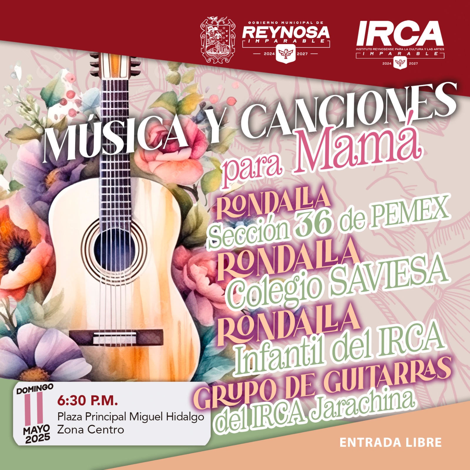En el marco del Día de las Madres, el Gobierno de Reynosa, que preside el Alcalde Carlos Peña Ortiz, a través del Instituto Reynosense para la Cultura y las Artes, invita a disfrutar de una programación para homenajear a las madres de la ciudad el próximo domingo 11 de mayo a partir de las 6:30 P. M. en la plaza principal «Miguel Hidalgo», en la zona Centro.