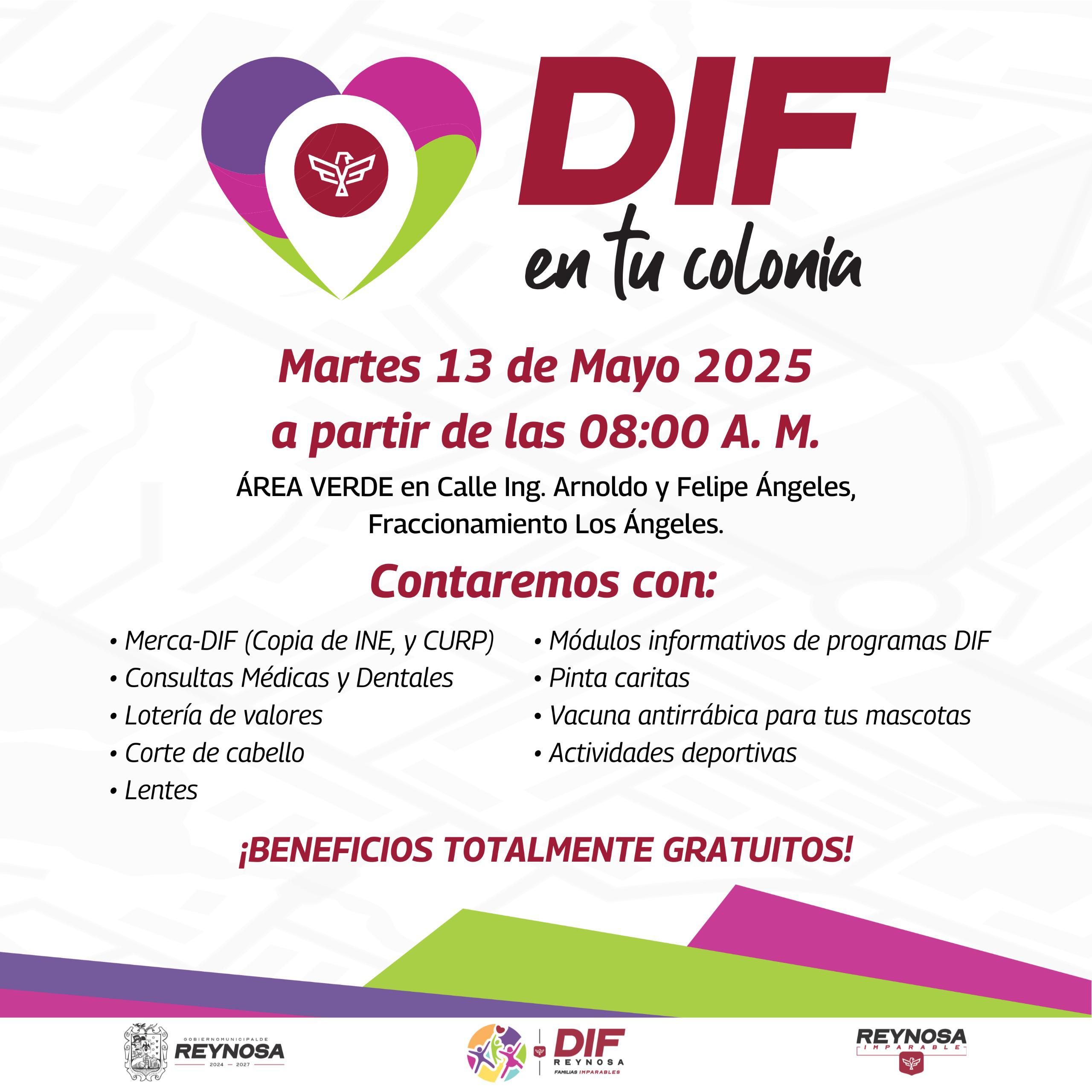 Por instrucciones del Alcalde, Carlos Peña Ortiz, el Sistema DIF-Reynosa, que preside Carlos Luis Peña Garza, realizará la Brigada “DIF en Tu Colonia”, en el Fraccionamiento Los Ángeles, por lo que se invita a las familias del sector y aledaños a beneficiarse de los programas y servicios gratuitos.