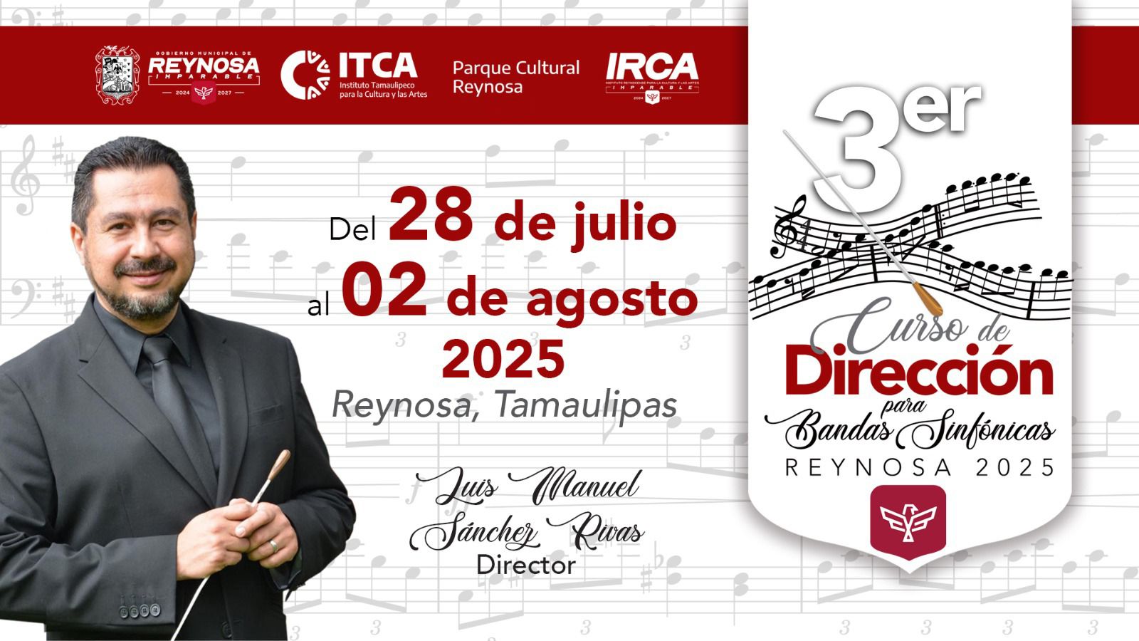 El Gobierno de Reynosa, que preside el Alcalde Carlos Peña Ortiz, invita a músicos y directores musicales a participar en el 3er Curso de Dirección para Bandas Sinfónicas, que se llevará a cabo del 28 de julio al 2 de agosto.