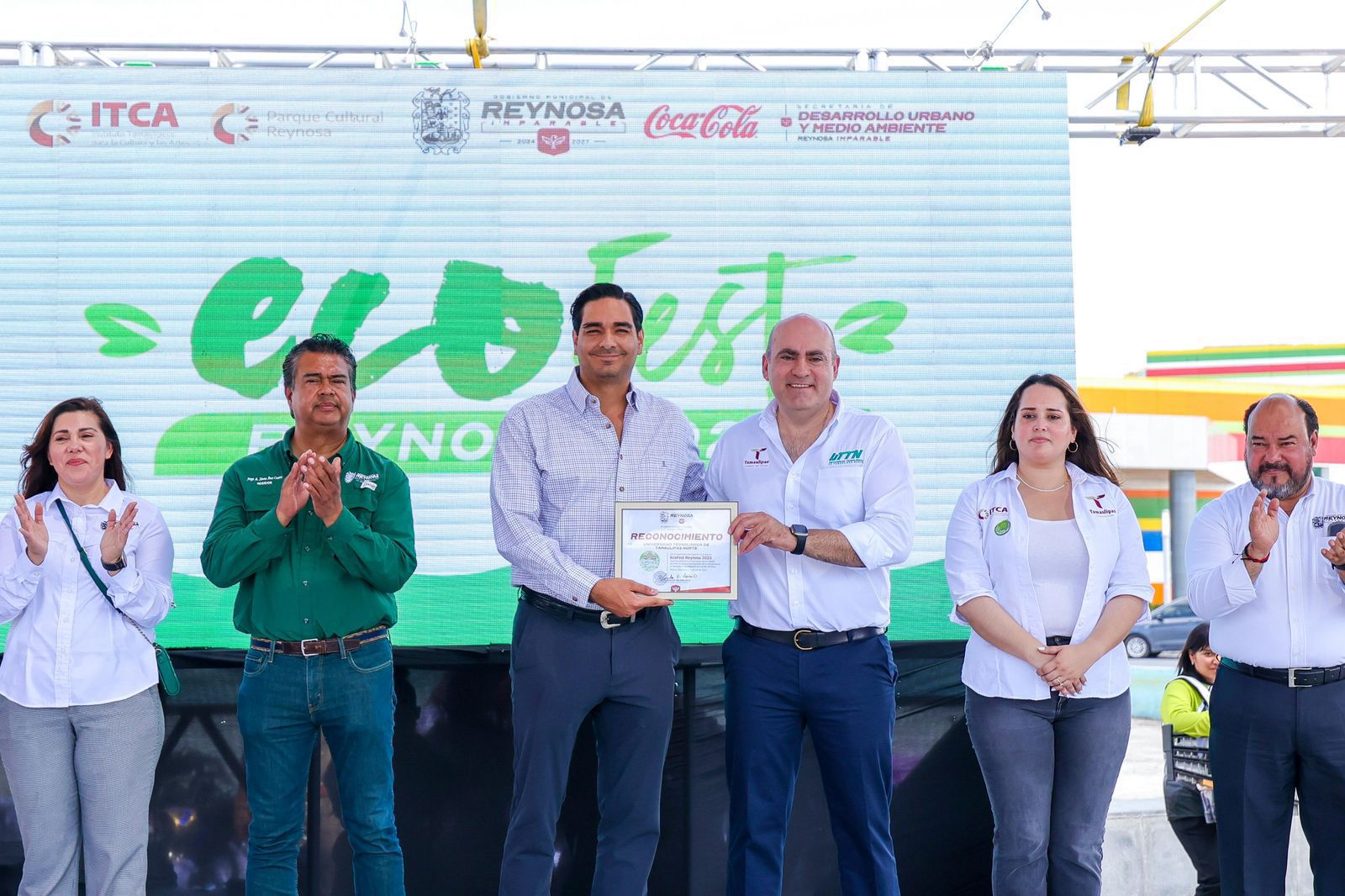 Un reconocimiento a su participación en el ECOFEST recibieron: Edgar Garza Hernández, Rector de la UTTN; ARCA Continental, y Grecia Daniela Jiménez Peña, Directora del Parque Cultural Reynosa, en presencia de la Secretaria de Desarrollo Urbano y Medio Ambiente, Noehmi Alemán Hernández y Aarón Misael De la Cruz Chávez, Director de Medio Ambiente del Gobierno Municipal.