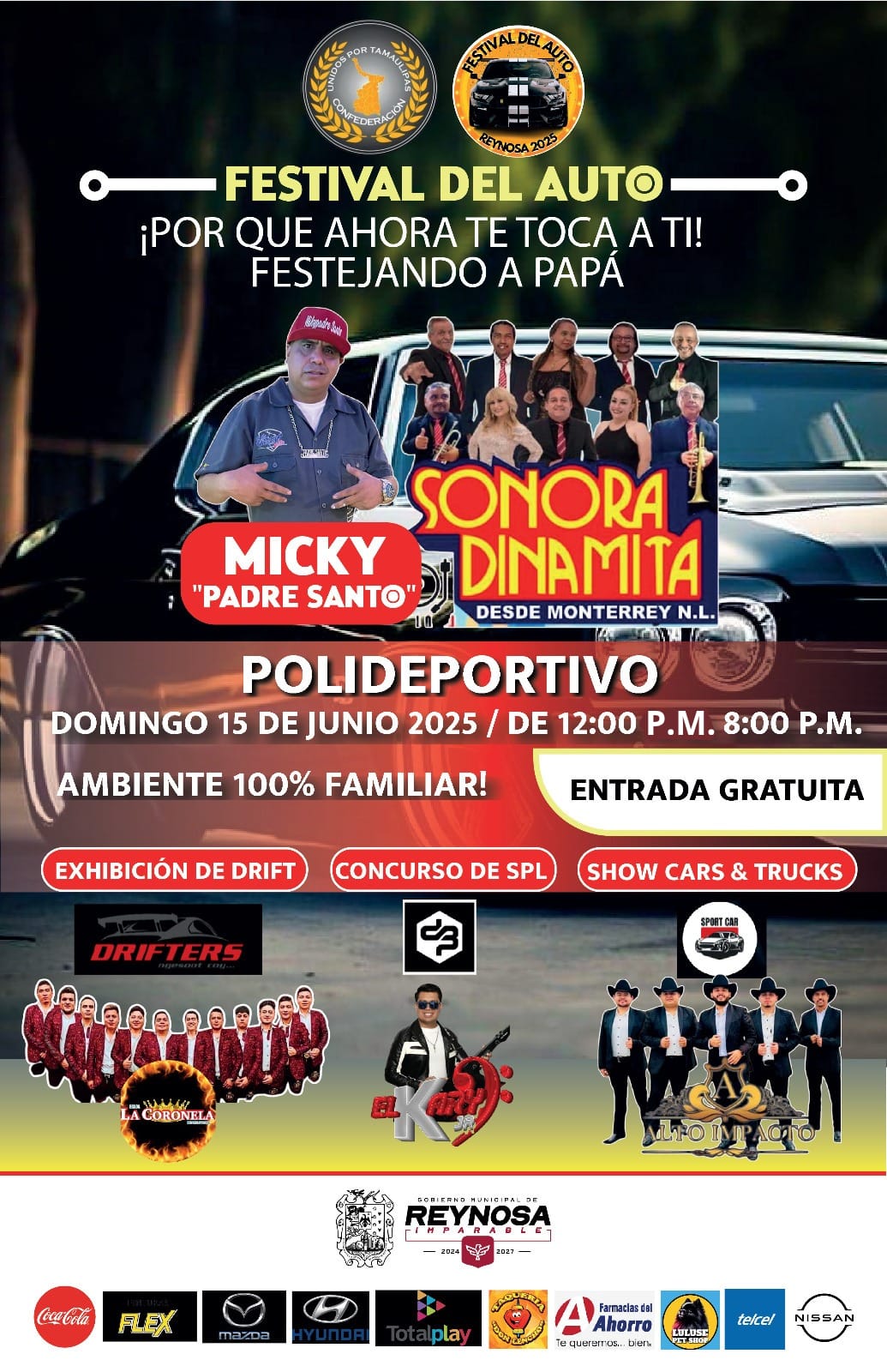 El Alcalde Carlos Peña Ortiz, te invita a disfrutar ¡GRATIS! el Festival del Auto Reynosa 2025, celebrando el Día del Padre, este domingo 15 de junio a partir de las 12:00 del medio día, hasta las 8:00 de la noche, en el estacionamiento del Polideportivo.