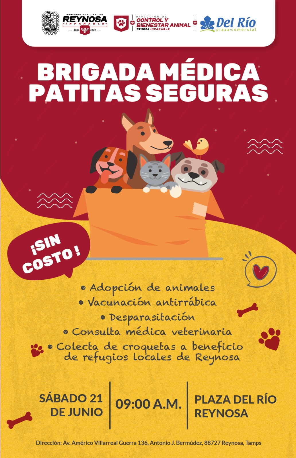 En Reynosa somos una ciudad compasiva con la vida animal, participa; el Presidente Municipal Carlos Peña Ortiz te invita a la brigada médica veterinaria Patitas Seguras, que se llevará a cabo en Del Río plaza comercial el sábado 21 de junio a partir de las 9:00 de la mañana.
