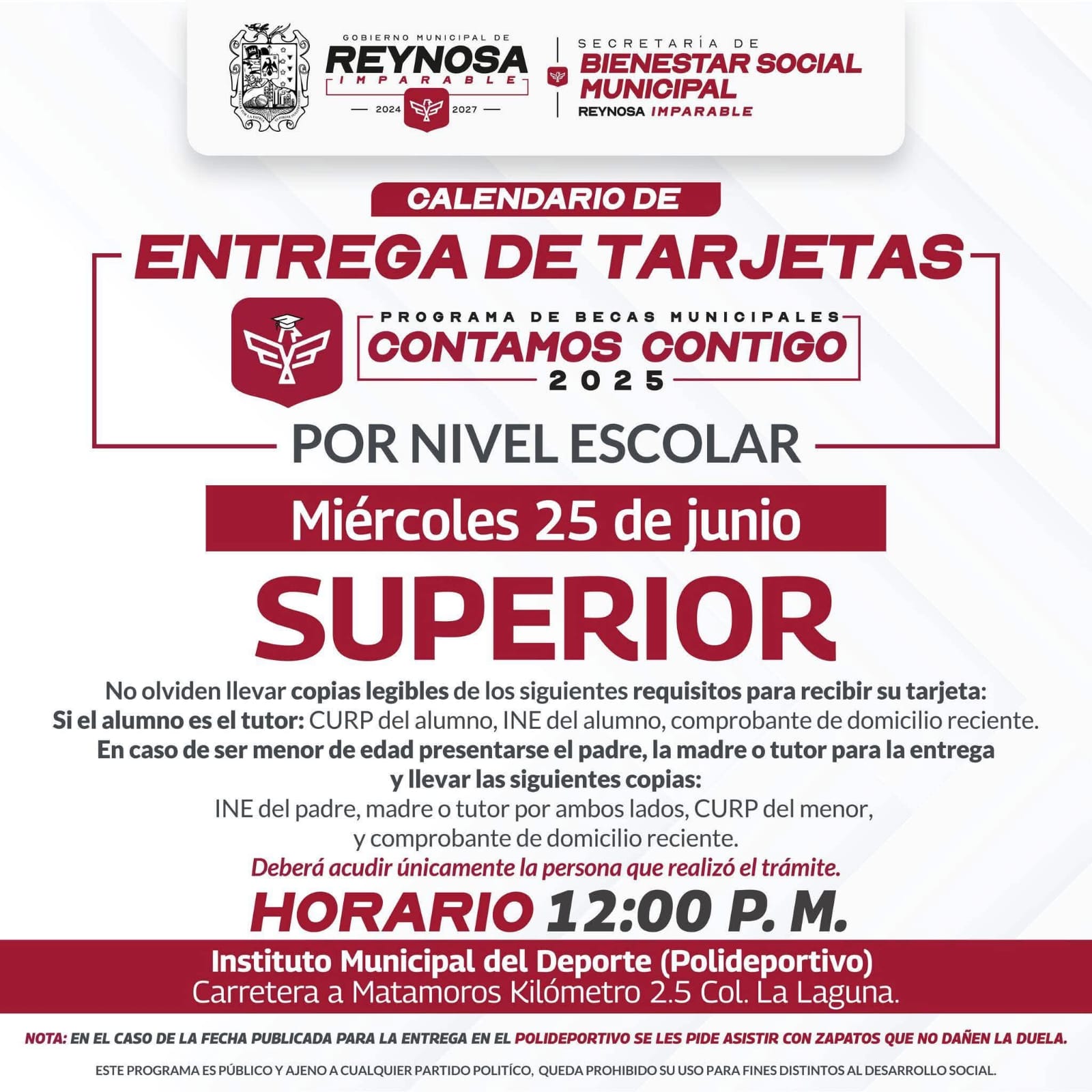 El Presidente Municipal Carlos Peña Ortiz hará entrega de las Tarjetas del Programa de Becas Más Grande en la Historia de Reynosa, para beneficiarios de Educación Superior, este miércoles 25 de junio en el Polideportivo a partir de las 12:00 del medio día.