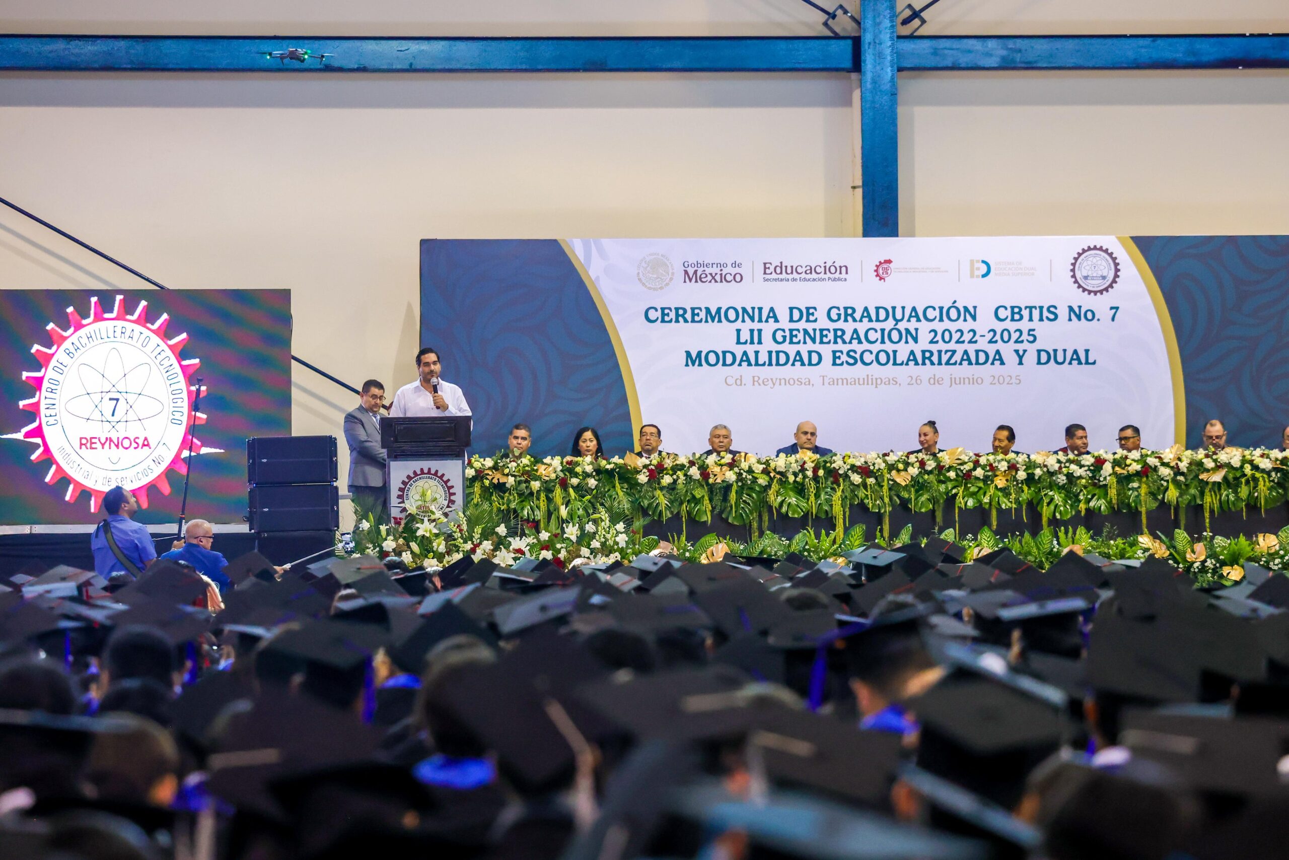 «Felicidades a todos los graduados el día de hoy, por el gran sacrificio que han hecho para llegar a este día tan importante y el día de hoy culminan una nueva etapa de su desarrollo educativo», declaró el Alcalde Carlos Peña Ortiz en la graduación de estudiantes del CBTIS 7 que dirige la Dra. Brenda Lilia Godina Tovías.