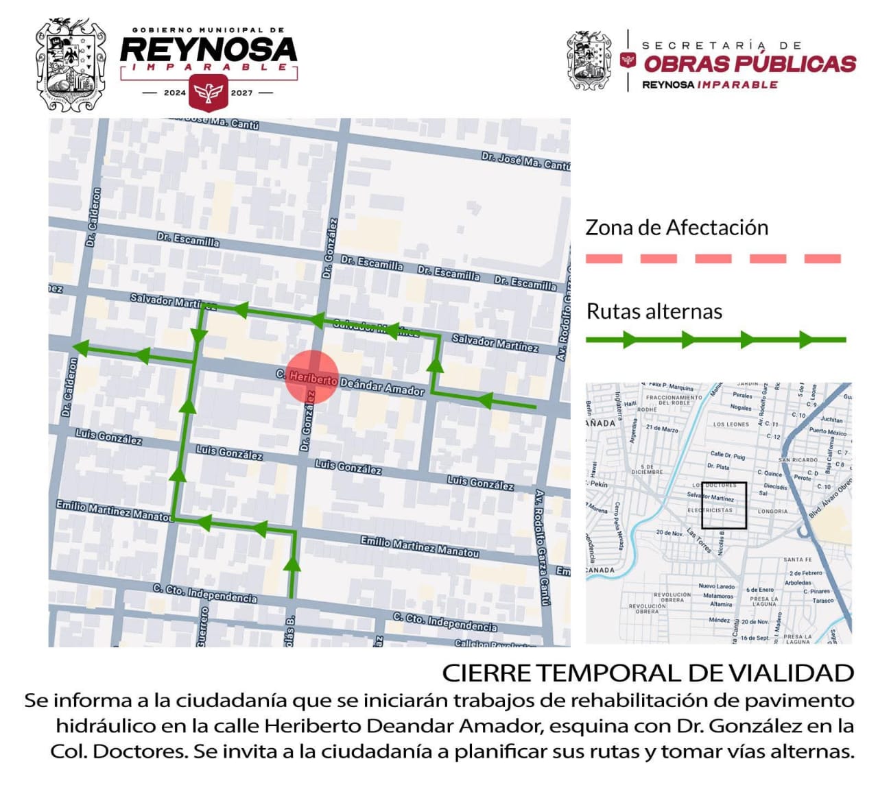 El Gobierno Municipal de Reynosa informa que a partir del lunes 30 de Junio, iniciará la rehabilitación de pavimento hidráulico en la calle Heriberto Deandar Amador, esquina con Doctor González, de la colonia Los Doctores.