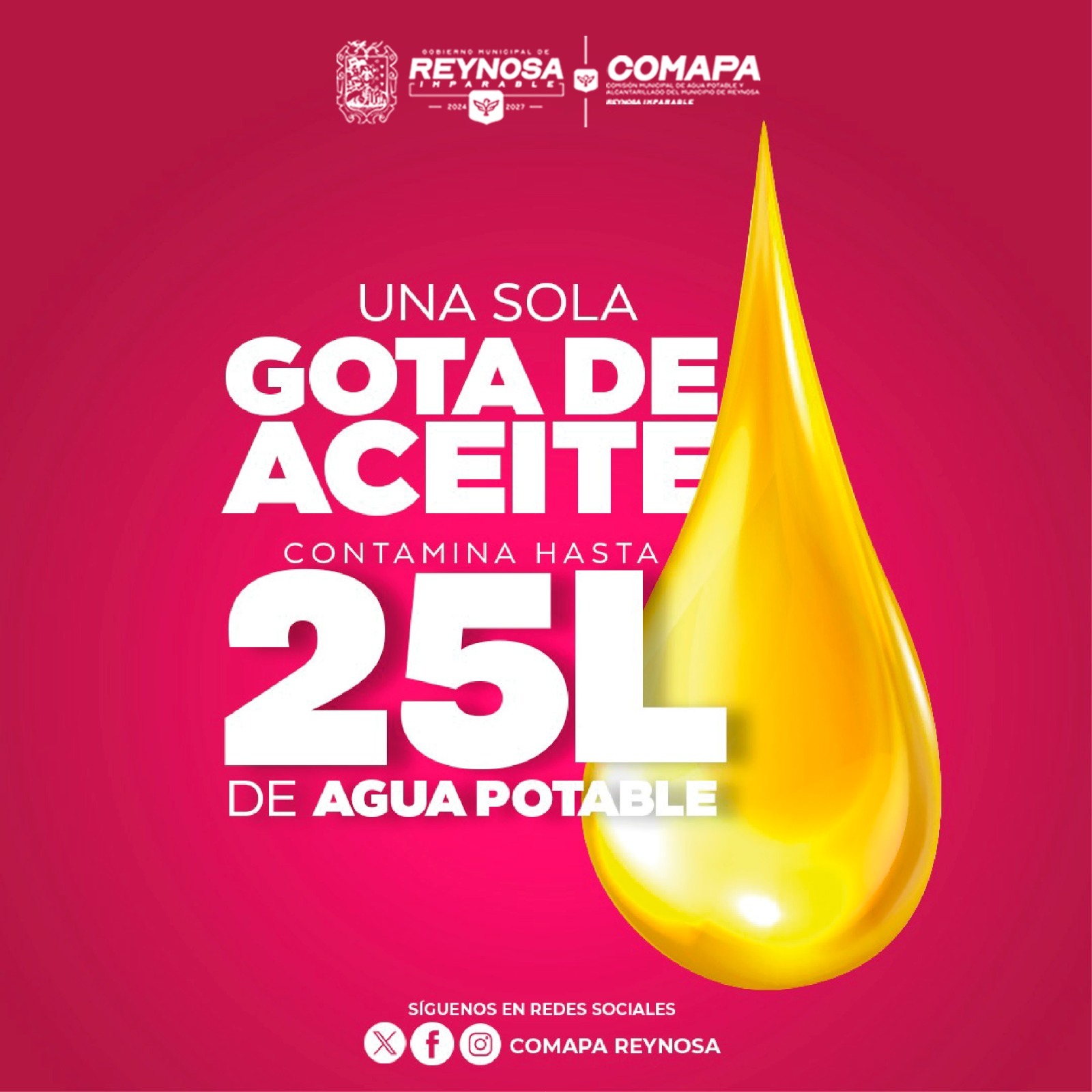 La Comisión Municipal de Agua Potable y Alcantarillado hace un llamado a la ciudadanía a evitar arrojar aceite usado por el fregadero o en la vía pública, ya que esta práctica daña gravemente el medio ambiente, obstruye las tuberías y contamina nuestras fuentes de agua.